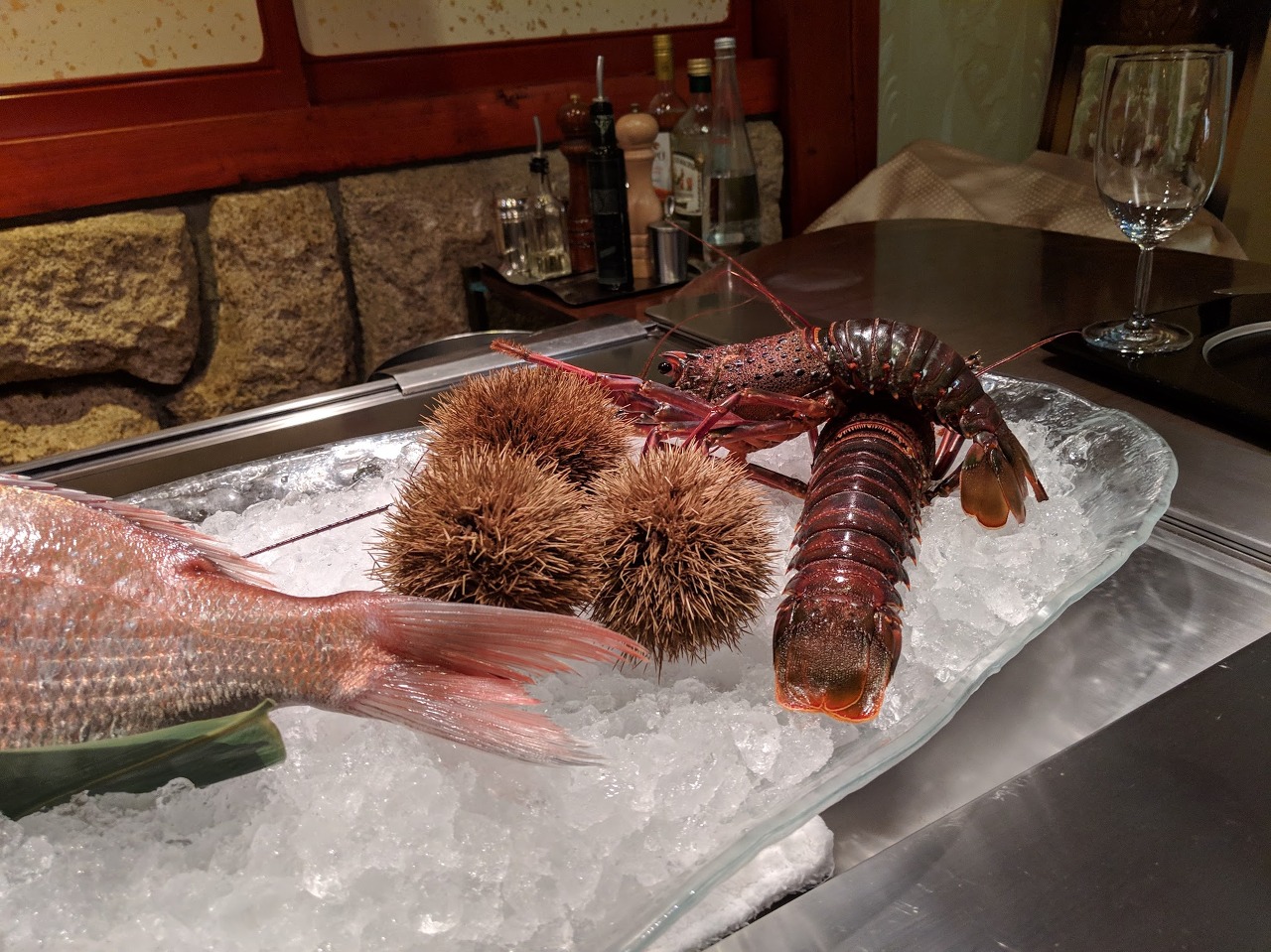 자리에 앉으면 이미 그날의 재료가 철판 너머 얼음 디스플레이에 정갈하게 준비되어 있습니다. 들어가자 마자 대궐같이 넓은 내부에 한번 놀래고 빛깔좋은 재료에 한번 더 놀래요.