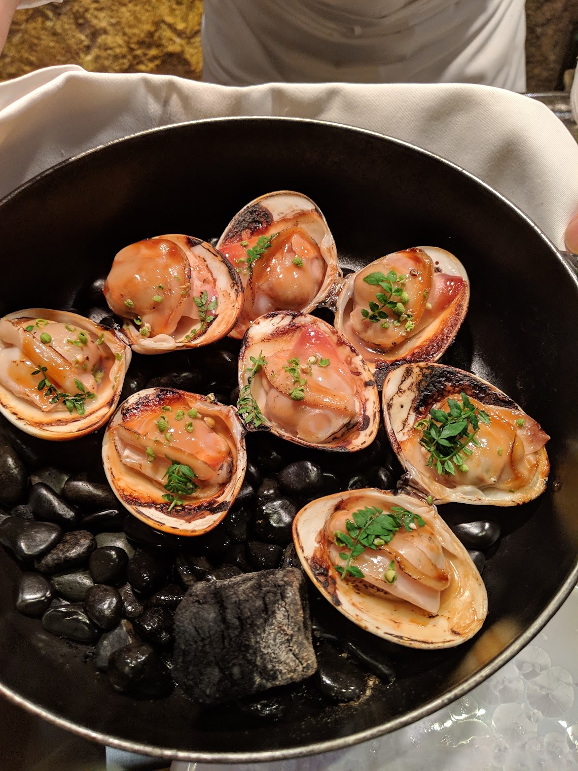 뜨거운 돌 위에 서빙해주시는 조개구이도 비리지 않고 깔끔하고 훌륭한 맛입니다. 이 식당의 특징은 양념이나 조리법 자체가 정도를 지켜서 재료 본연의 맛을 끌어내는 것에 집중하신 것 같아요. 복잡한 소스와 어디서도 맛본 적이 없는 창의적인 맛을 내기 보다는 최상의 재료를 가장 맛있게 요리해 내는 것에 우선을 둔 느낌입니다.