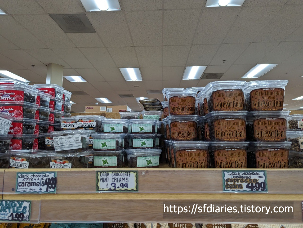 다크초콜렛으로 코팅한 제품이 정말 많죠. 건체리와 건포도 버젼도 보이네요. 건조된 체리는 미국에서도 꽤 비싼편인데 5.49라면 트레이더 조스 답게 가성비가 정말 좋아요.