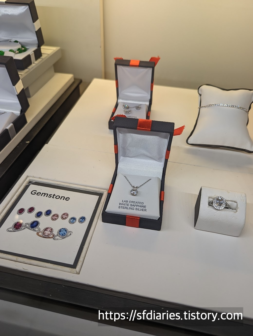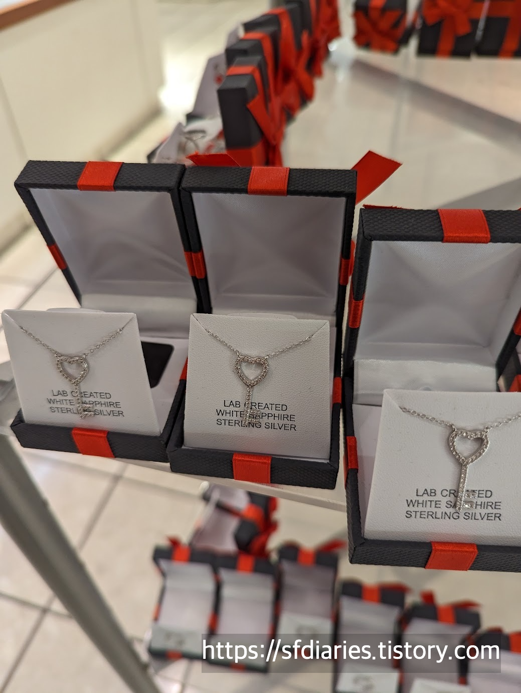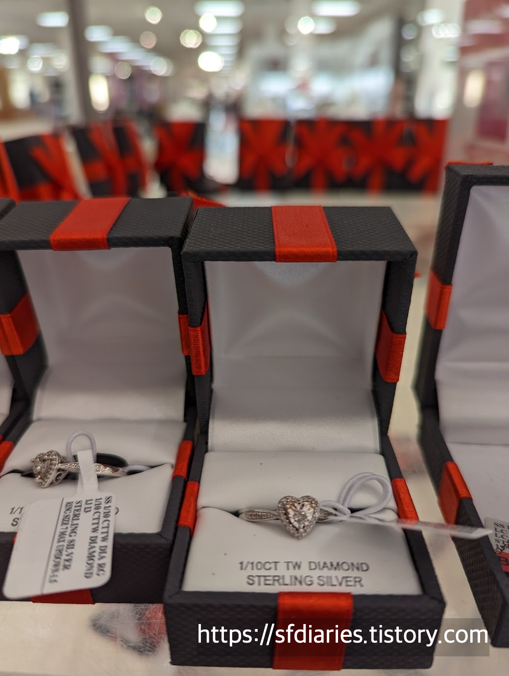 이 반지도 1/10캐럿의 매우 작은 다이아가 하트 정중앙에 박혀있는 디자인입니다. 크기도 적당하고 디자인도 귀엽게 잘 나왔어요. 하트모양 자체가 다 다이아몬드는 아니라는 점만 참조해주세요. 하트 정중앙에 다이아 한알, 하트 모양을 둘러싸고 다이아몬드가 세팅된 디자인입니다. 작은 다이아지만 36개가 알알히 박혀있어서 기분좋게 쓰실 수 있을 것 같아요. 이 외에도 다양한 가격대의 진짜 다이아몬드 제품도 많이 있고요. 전체적으로 미국은 우리나라보다 다이아몬드가 저렴하고 세일도 많이 해주니까요. 다만, 면세쇼핑은 딱히 활성화되지 않은 곳이기 때문에 보시는 가격(+세금) 그대로 가져가신다고 보시면 될 것 같네요.