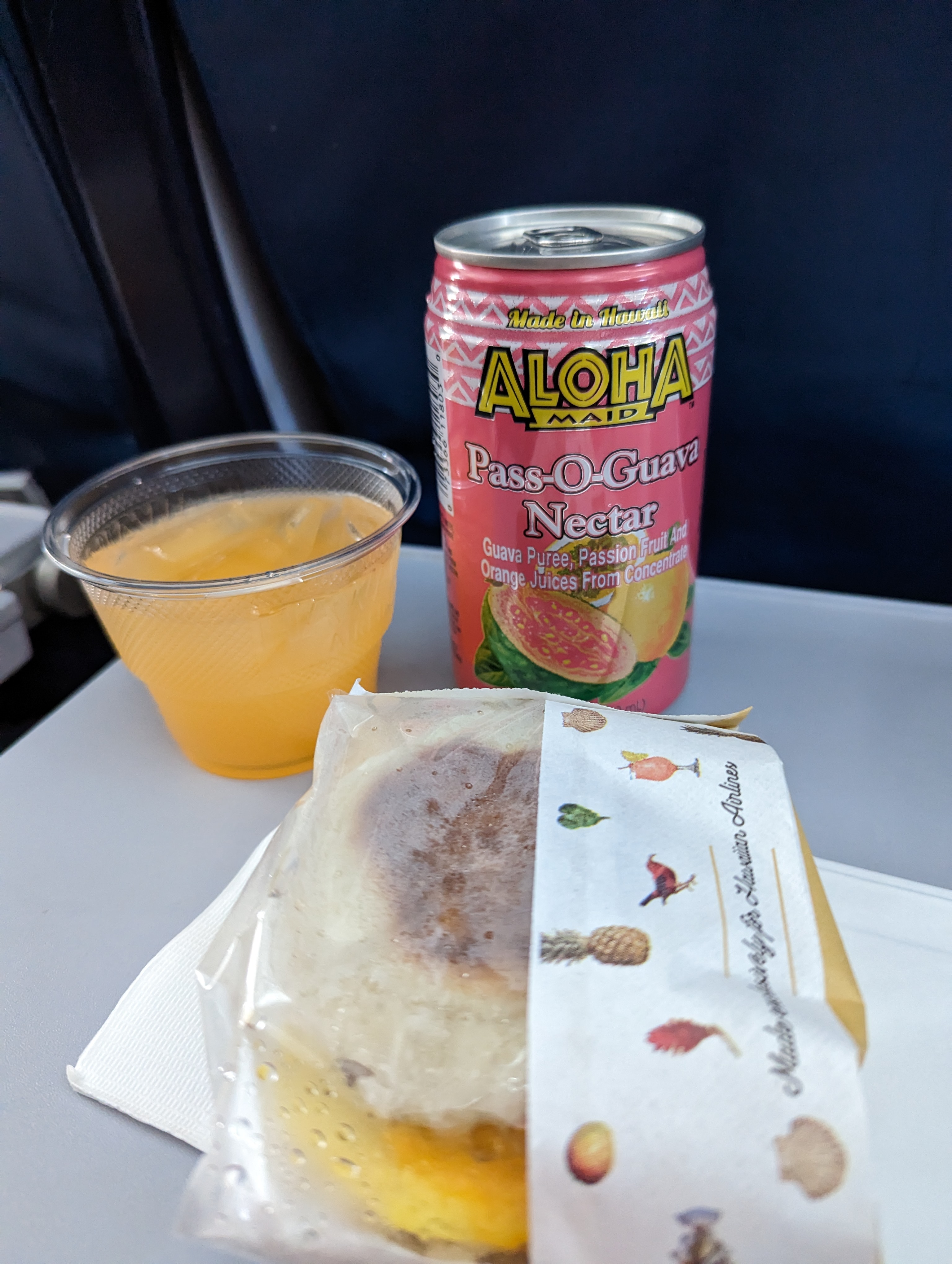 하와이안 항공은 처음 타봤는데, 기내식에 꼭 나오는 알로하 메이드 Aloha maid의 POG (Passionfruit Orange Guava) 쥬스가 궁금해서 마셔봤어요. 정말 달달하고 맛나요! 이건 추천입니다. 하와이 시내 곳곳에서 파는 쥬스니까 어느 항공으로 가셔도 꼭 드셔보세요.