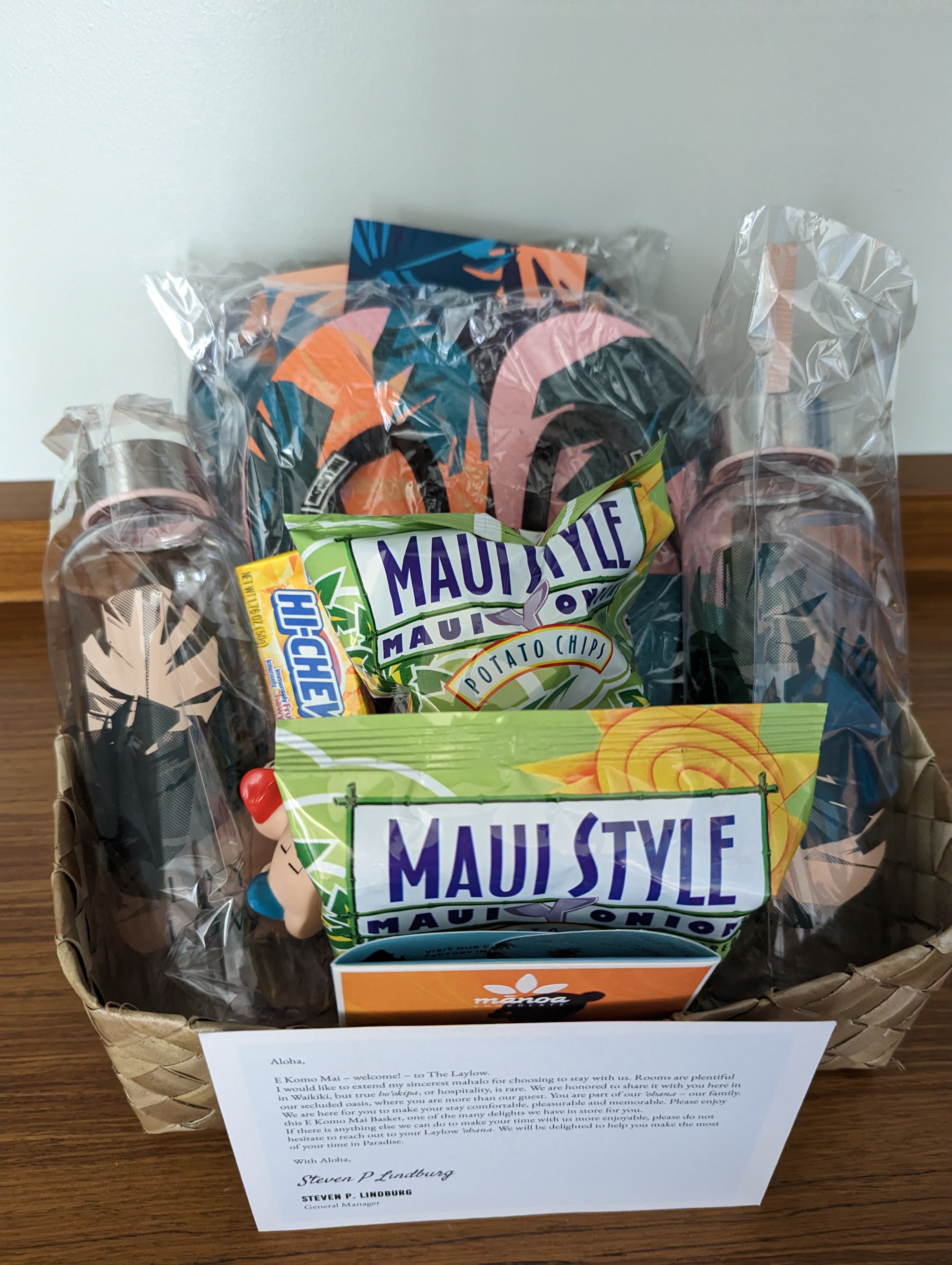 이렇게 귀여운 웰컴바스켓도 줍니다. 하와이 호텔들이 환경보호를 위해서 일회용 물병을 안주는 경우가 많다고 들었어요. 더 레이로우 호텔은 1층 피트니스 센터 가는 길에서 물을 받을 수 있는데요, 냉수도 있었지만 스파클링 워터가 너무 취저라서 열심히 받아 마셨습니다. 슬리퍼도 비치 갈때 유용하게 잘 쓰고 기념삼아 가져왔어요.