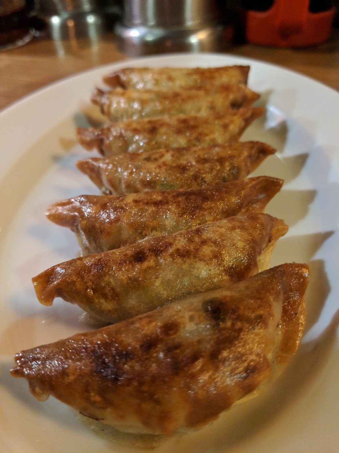 메뉴 구성은 간단합니다. 야끼교자(군만두)와 스이교자(물만두), 그리고 마늘의 유무를 선택하시면 되요. 저희는 야끼교자만 여러번 시켜먹고 나왔습니다. 마늘이 없는 교자도 궁금해서 먹어봤는데요, 물론 마늘이 들어간 교자를 추천드립니다. 일반적인 일본 교자보다 만두피가 얇고, 크루아상이 연상될만큼 피에 기름이 잘 베어있어요. 보시는대로 평균적인 교자보다 크기가 작지만 씹을때마다 육즙이 입안에서 팡팡 터집니다. 육즙을 남김없이 드시려면 조금만 식혀서 한입에 드시는게 좋아요.