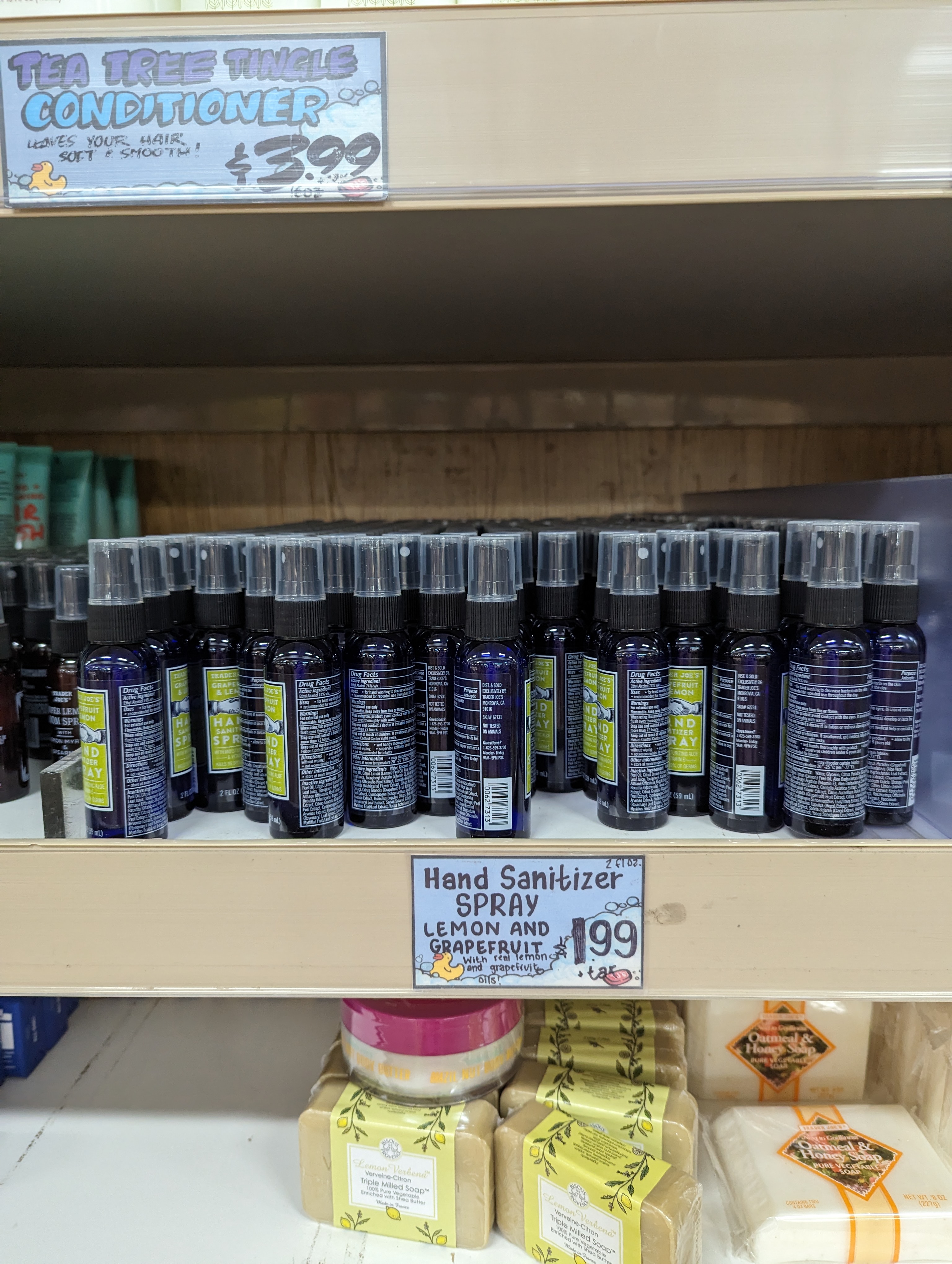 고체비누 치약 캔들 핸드워시 페이셜미스트 바디로션 등등 필요한 제품은 다 있어요. 여행하시다가 급하게 필요하신 제품이 있으시면 트레이더조스에서도 이렇게 판매하고 있다는 점 기억해 두시면 좋겠죠. 미국은 드럭스토어도 가격이 많이 올라서 같은 종류의 제품을 월그린스나 CVS에서 사시면 가격이 두배는 훌쩍 넘거든요. 몇가지 인기 제품 및 추천 제품 소개해 드려볼게요.