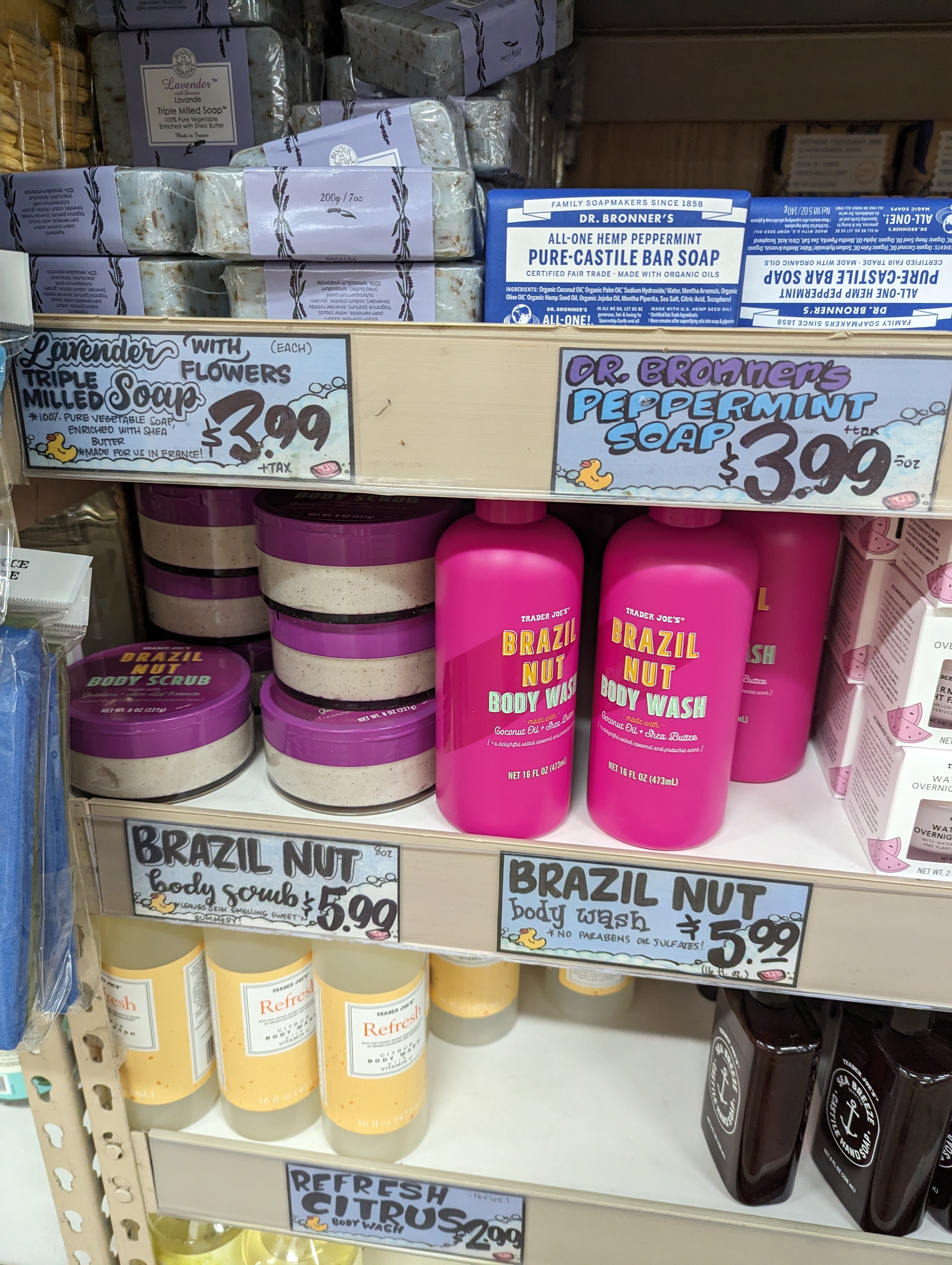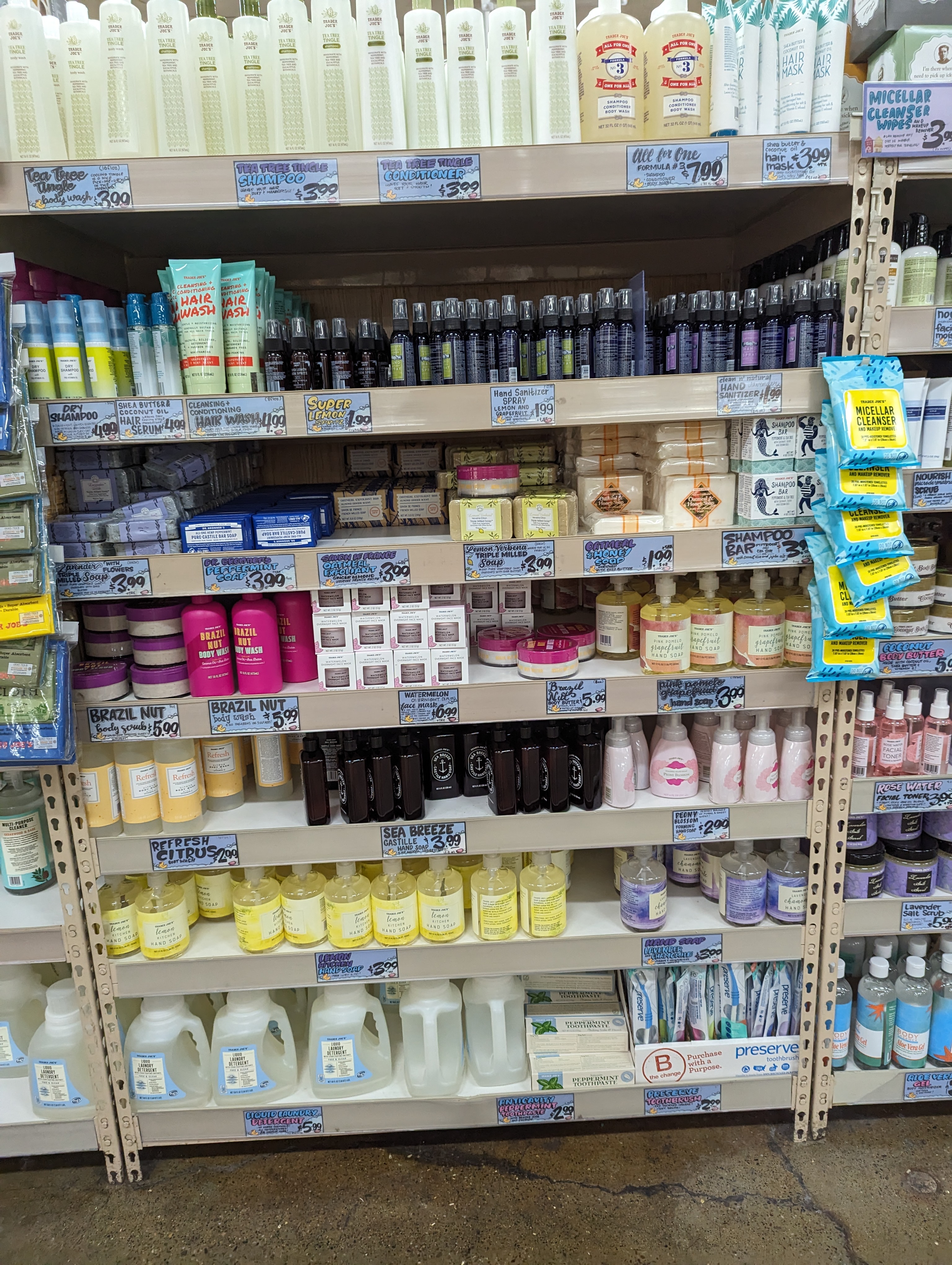 사진에는 가격표만 나왔는데 티트리 샴푸 컨디셔너 라인은 유명한 폴미첼 티트리 샴푸 컨디셔너 (Paul Mitchel Tea Tree Special Shampoo, 개당 40달러선) 제조사와 같은 곳에서 만든다는 소문도 있습니다. 고체비누는 트레이더조스 자체 브랜드 제품은 2달러 정도, 닥터 브로너스 제품은 4달러에요.