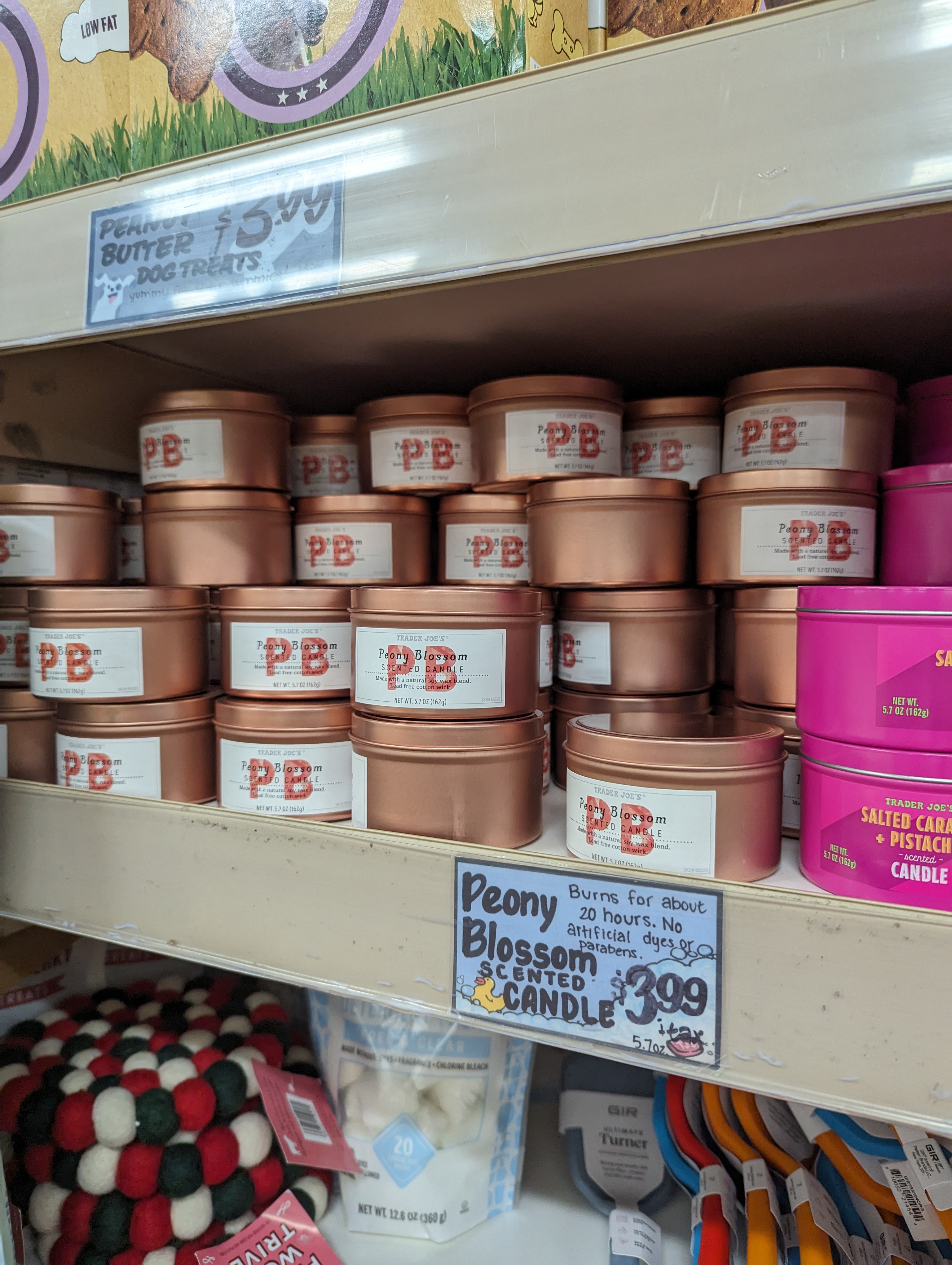 인공 착색료가 들어가지 않은 틴캔들은 4달러입니다. 작고 귀여워서 선물용으로 좋아요. 시즌마다 향이 달라지는데요 지금은 salted caramel pistachio, peony blossom 이렇게 준비되어 있네요.