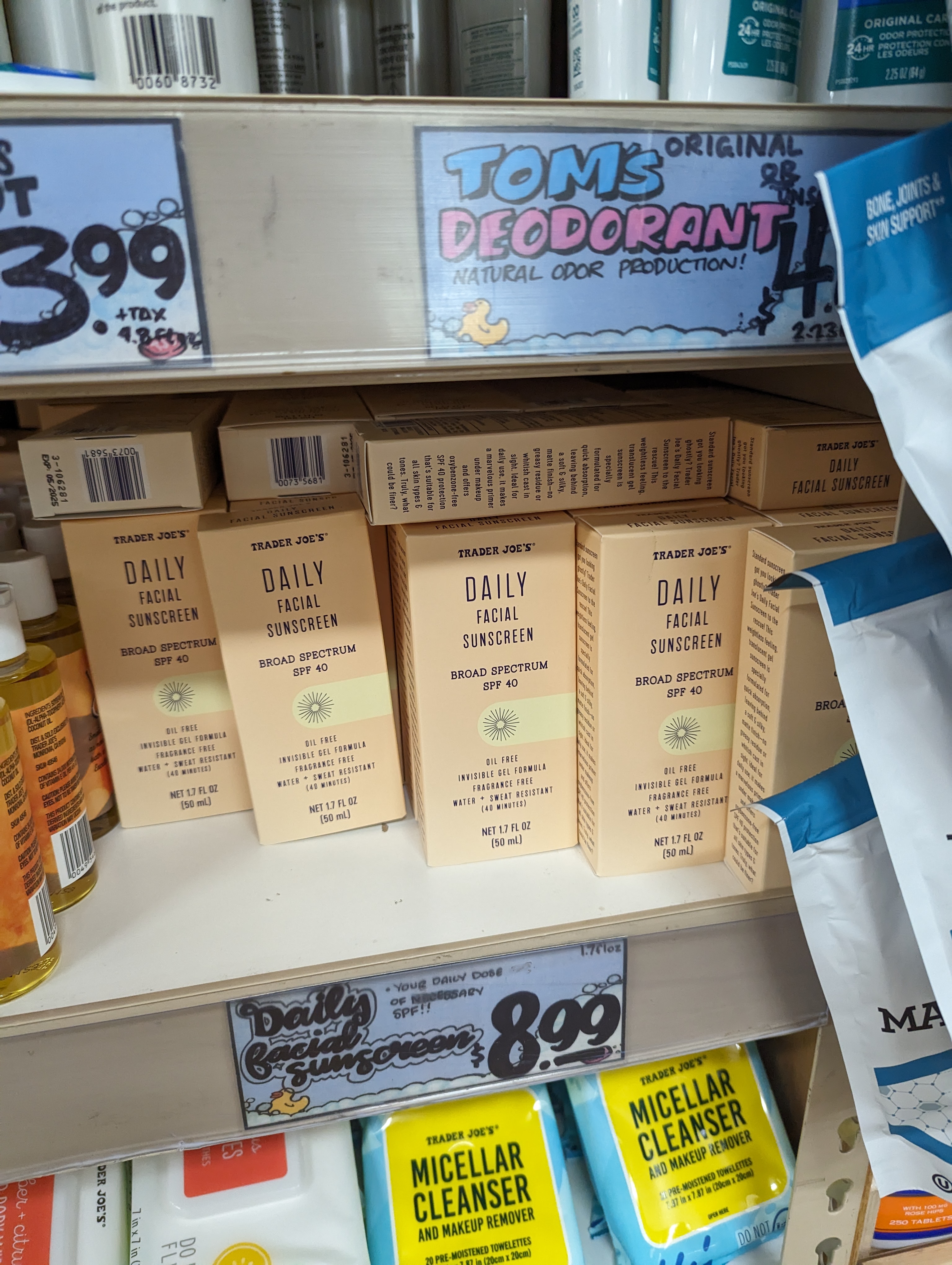 그 유명한 선크림의 트레이더조스 버전이 바로 이 Daily Facial Sunscreen SPF40 이에요. 9달러의 가벼운 가격으로 만나보실 수 있답니다. 처음 출시되자마자 품절대란을 일으킨 제품인데요, 지금은 다행히 재고가 있네요.